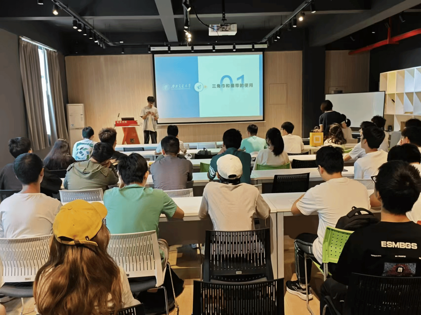 活动现场,医学院急救培训团队以“理论加实操”的形式展开教学,主讲人先以实例,强调了急救在应对突发情况时的关键作用。在随后的实操环节,主讲同学详细演示了三角巾包扎,环形包扎等不同止血技术以及心肺复苏,AED使用等必备技能。