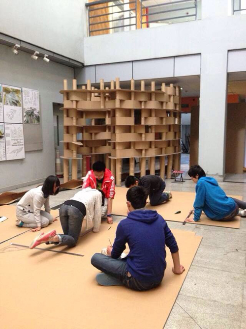 在这个多风多雨,又时有阳光的初夏展开了我们的建构之旅,第一次,将自己静卧纸上的蓝图变为现实。首先,要做的第一件事就是利用集体的智慧对原方案进行优化改进,从外观造型到材料使用,从大体承力到节点设计,每一个细节被一一推敲,考虑完善——至少当时我们都以为一切已然天衣无缝。于是着手建造,每个组选择的材料都不尽相同,纤维板,PVC管、瓦楞纸、木材、竹子、麻绳、亚克力板、砖,甚至有的组在一开始选择了钢板。我们为了这些自己设想中的材料,跑过建材市场,求助于本地同学或是上网搜索,在实际了解到不同材料的特性后,我们也开始了对方案的重新反思,进行优化改善。