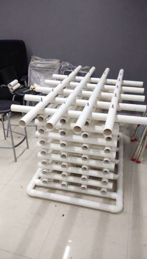在模型的实际搭建过程中,现实的物理问题成了无法回避的难题。好看的框架未必能立得住,一放手分分钟垮塌,麻绳的自重让整个顶都变了形,再也不是想象中美好的曲线,过于柔软的PVC管难以承受任何外力,任何轻微的摇晃都能使它面目全非,PVC板的自重让昨夜才刚刚成型的模型一夜垮塌。其实从这时起,我们才真正意义上开始认识我们所选择的材料是否真的可行。于是我们重新审视之前的设计,着手修改,让梦想继续向现实迈进。