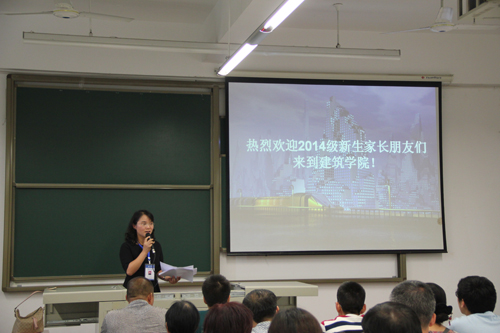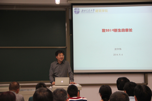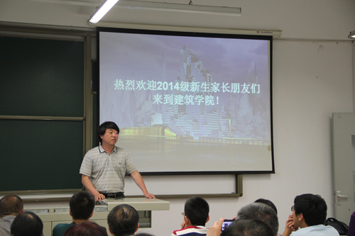 沈中伟院长向各位家长简要地介绍了建筑学院建筑学、风景园林、城市规划三个专业特色及近年来取得的成就,特别是在2014年全国建筑学专业(本、硕)评估工作中,建筑学专业本科、研究生教育评估获得七年期最高级双优秀通过。随后,从先进的办学理念及人才培养目标、教学科研及一流的师资队伍、优越的文化氛围及良好的办学环境、国际化交流等方面做了全面介绍。最后沈院长讲到:希望通过这次家长见面会,架起学院与家长沟通的桥梁,与学院共同培养孩子,让学生们在学院和家长的呵护下健康成长。