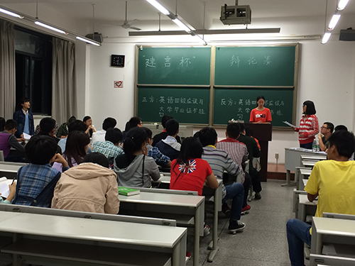 建筑学院在x8539举行了 “建言杯”辩论赛。此次辩论赛的两个主题都较为贴近大学生活,一是“英语四级是否应该与大学毕业证挂钩”,二是“高校是否应该对社会人员开放”。今日赛程的比赛分组为建筑一班对阵建筑三班,建筑二班对阵风景园林。除了来自建筑学院的评委,本次活动还有来自土木、数学等学院的嘉宾助阵。辩论赛前各组的赛前准备做得非常充分,来自大二大三的前辈们也为大一新生做了指导,现场气氛活跃。