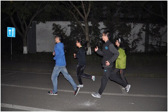 八点十分,夜跑正式开始,一条“人龙”迅速形成。来自磐石社的同学们一马当先,在队伍首端领跑,为同学们做路线指引,以合适的节奏在夜色校园中拉出一道美丽风景线。从北区篮球场附近出发,沿着靠近西门的校园路跑步南至足球场,然后又向北折回,途经虹桥、图书馆以及北区宿舍楼,最终回到了夜跑出发点,整条路线长达三公里。虽然夜间寒风习习,但在黄色路灯下奔跑着的同学们丝毫不畏惧冷风,不时地调整着自己的步伐,向着既定目标勇敢地冲刺,同时建筑学院学生会也做出细致的安排,夜跑途中安排专门人员跟随,以保证同学们在夜跑活动中的安全。没过多久,在终点等候的工作人员就迎来了第一位胜利者,而此后,越来越多的同学紧跟前面同学的步伐陆续到达了终点。迎接他们的不仅有组织者们热情的微笑、路人赞许的目光,还有象征着勇往直前的精美的礼品,同学们付出汗水与坚持,收获健康与愉悦心情。八点半左右,所有夜跑参与者都顺利地完成了任务,休息之余,大家互相问候,讨论着各种有趣的话题,夜跑活动也给同学们提供了结交朋友的好平台。