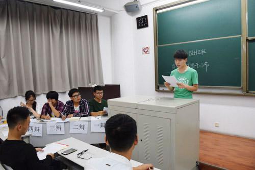 建筑与设计学院2015级“建言杯”新生辩论赛在建筑馆展开,共六场比赛,分为两轮进行。建筑与设计学院辩论队队长陈强、张仲怡、金超、土木与工程学院辩论队队长陈佳佳、物理学院辩论队队长汤桦、经管学院辩论队队长孟乐赟、公共管理与政法学院辩论队队长郭东来、物理学院辩论队队长李艺、机械学院辩论队队长虞超凡等担任本次辩论赛的评委