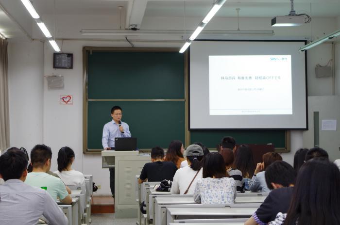 郝建功经理有着专业的人力资源管理知识和丰富的经验,他从“职业选择、简历优化、面试技巧、职场相关”四个方面为同学们进行了讲授。首先是职业的选择,郝建功尤其强调了第一份工作对于人生的重要性,同时提出:公司需要合适的人而非最优秀的人。之后,郝建功介绍了个人简历制作的注意事项,并以在场同学的简历为案例,深刻剖析了案例的优势与不足,并提出“照片”、“繁简”、“逻辑”、“针对”四个关键词。第三部分是面试技巧,郝建功从仪态和技巧两方面阐述,着重分析了应对不同面试方法所需的不同策略。第四部分是初入职场的注意事项,他总结出勤奋、自律、责任感、换位思考四个关键词。最后郝建功进行讲座的总结,他强调了保持积极心态的重要性,期待大家都能走出灿烂的职业之路。