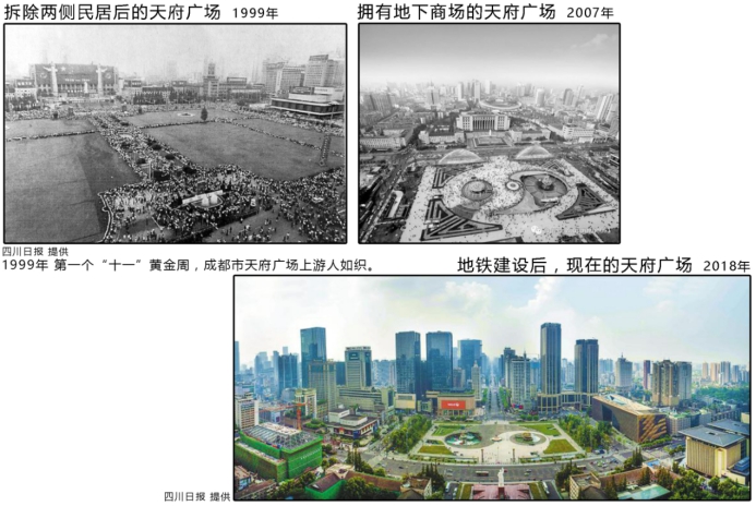 对于成都地标性节点——天府广场来说,其巨大的变化是时代发展的缩影。由康熙年间的皇城改建为贡院,密密麻麻的低矮的考棚是全川学子参加乡试、考取举人的科考场子。随着新中国的成立,古老的建筑逐渐被拆除变成了大型游行广场,原来的“致公堂”被拆除建起了“万岁馆”,后来改为“科技馆”。如今的天府广场周边高楼林立、商贸繁荣,景象与昔日大有不同。