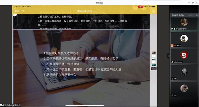 为鼓励和支持我校大学生积极探索生涯发展道路,通过就业实践和能力训练,不断提升就业竞争力和职业成熟度,2020年11月23日晚上7点,我院开展了研究生求职实习分享会,分享会由2019级城乡规划班吴汶亭、2018级建筑专硕2班陶婧两位学姐主讲,所有2020级建筑类研究生参加了本次分享会。