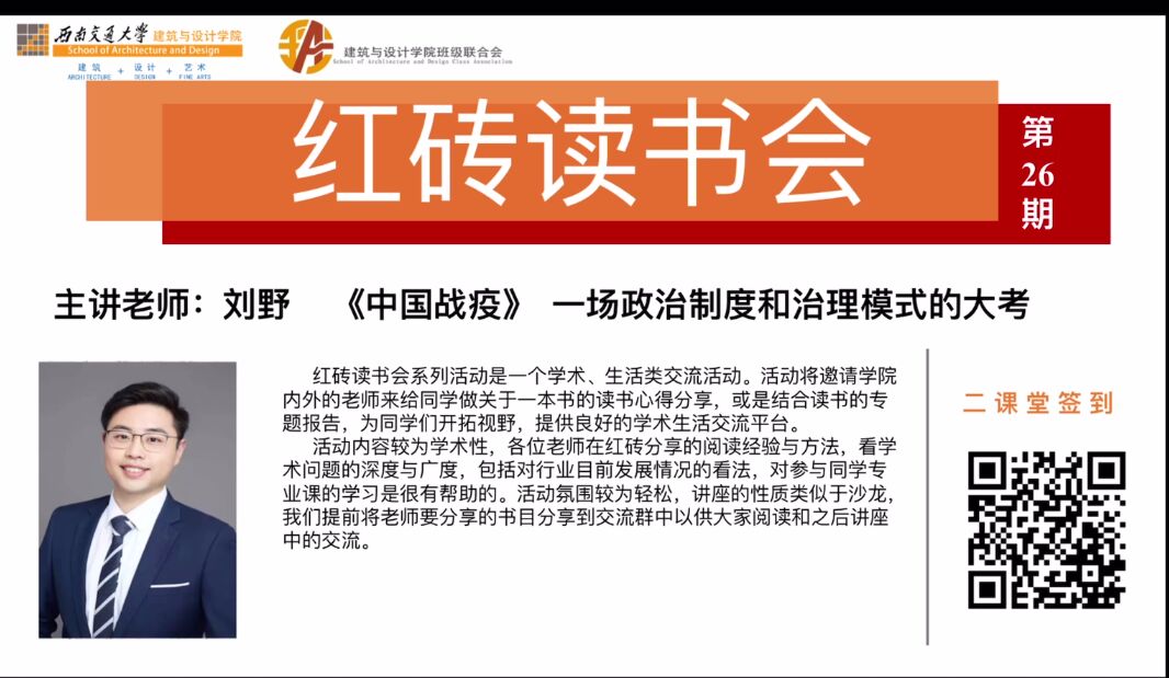 为了增强学生对国家抗疫的了解,感受新冠疫情下中国的经验积累和大国风范,2020年12月14日20:00,由建筑与设计学院主办,班级联合会会承办的“红砖”读书会第二十六期以线上的方式顺利举办,本次读书会邀请了我院2017级艺术类辅导员刘野担任主讲,分享了张维为的《中国战役!》一书。