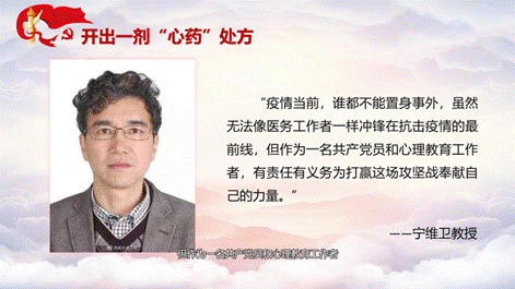 第二,率先垂范,在心理战疫中发挥党员先锋模范和党组织战斗堡垒的作用。习近平总书记指出在关键时刻冲得上去、在危难关头豁得出来,才是真正的中国共产党人。宁维卫教授在抗疫中,积极组织老师,很快做出了相应的心理防疫手册,同时在抗疫过程中不忘脱贫攻坚,奔波在抗疫和扶贫的第一线,为抗疫、扶贫送出了一剂心药良方;探花视频