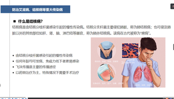 其次,会议提到常见的传染病——结核病。结核病是慢性传染病,据2020年世界卫生组发布报告,估计2019年全球新发现结核病患者近1000万例,死亡患者约141万例。2021年3月24日是第二十六个“世界防治结核病日”,主题是“终结结核流行,自由健康呼吸”。为此,班长呼吁同学们在日常生活中要保持良好的生活习惯、加强锻炼、提高免疫力、避免与传染性结核病患者接触。