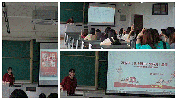 紧接着,苏润,陈畅,杨玄桦三位预备党员同志分别就“中华民族伟大复兴的三大里程碑”、“学习党史的重要意义”、“党史学习教育意义及发展脉络”给大家阐述了中国共产党的历史,让同学们进一步深刻理解到党的历史是砥砺前行、攻坚克难、刀刃向内、不断前进的历史,增强了同学们的爱国主义精神。