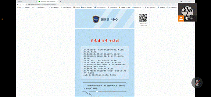 下午20:10,建筑与设计学院2020-2021学年研2019级设计类大班“防诈骗”线上宣传教育主题班会顺利结束。通过“防止网络诈骗”等形式多样的宣传教育方式,同学们了解到当下电信诈骗的惯用手段和防范技巧等内容,进一步提升了同学们的防诈骗意识,为杜绝学生参与违法犯罪活动,谨防网络诈骗,共建平安校园起到了积极的作用。