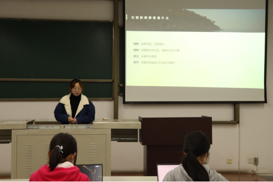首先,赵洁同学从新闻稿的概念、分类、内容等基础内容展开,循序渐进的进行梳理和讲解,着重介绍了新闻稿的写作方法,她强调:在新闻的采访过程中要做好记录、收集与整理三个过程,充分收集素材,做到有备无患。撰写新闻稿时,要客观公正,以真实事件为基础,简洁精炼的反映出事件的真实情况。此外,她指出,新闻的配图也不容忽视,这可以使新闻更加有真实性与感染力。在细心讲解了各类新闻稿的特色之后,她鼓励大家多学、多练、多改,将新闻稿撰写的技巧熟练掌握。