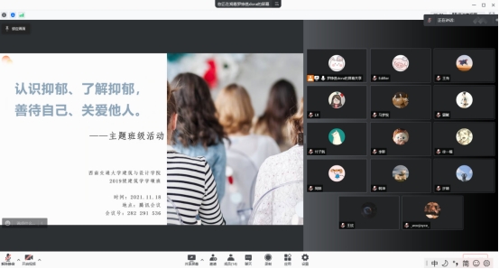 建筑与设计学院2019级建筑学学硕班于2021年11月18日晚20时,开展了以“认识抑郁、了解抑郁,善待自己、关爱他人”为主题的班级活动,鉴于目前疫情防控相关规定,此次活动在线上通过腾讯会议开展,由班级心理委员罗铮蒸和班长刘肖共同负责组织。