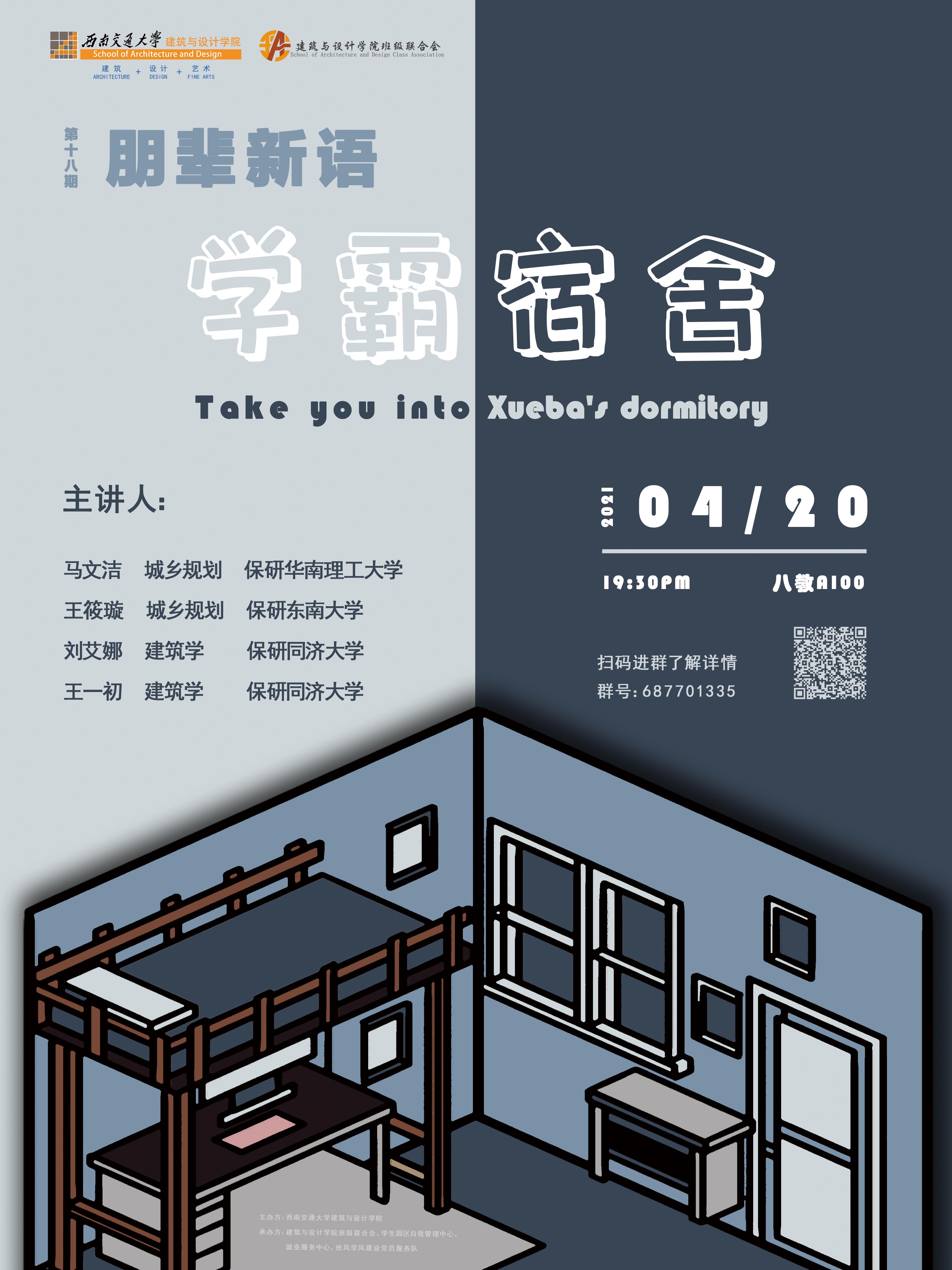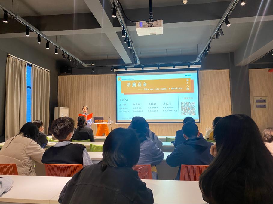 建筑与设计学院主办,建筑与设计学院班级联合会、学生园区自我管理中心、就业服务中心、班风学风建设党员服务队承办的朋辈新语‘学霸宿舍’在八教A100报告厅顺利进行。本次活动我们邀请到了‘学霸宿舍’的四位学姐,她们分别是来自建筑学专业的刘艾娜、王一初和来自城乡规划专业的马文洁、王筱璇学姐。