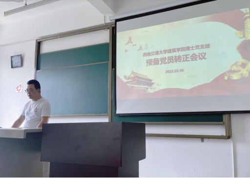 2022年5月6日10时,建筑学院博士党支部在X8321教室召开预备党员转正会议。此次会议中马杰茜同志发表转正志愿,并顺利由中共预备党员转为正式党员。