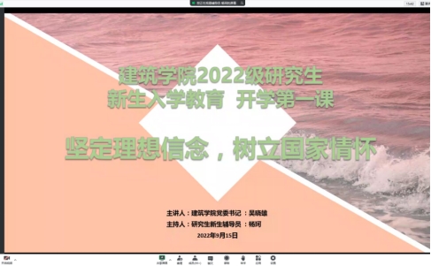 为培养新生树立良好价值观、怀揣坚定的理想信念,做一个爱家爱党爱国的新时代研究生,建筑学院于2022年9月15日19:00举办了2022级研究生新生入学教育之开学第一课“坚定理想信念,树立家国情怀”讲座。本次讲座由建筑学院党委书记吴晓雄主讲,建筑学院研究生新生辅导员杨珂主持,建筑学院全体研究生新生参与学习。