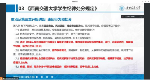 学生纪律处分规定》,将《规定》中的重点部分向大家逐个进行了说明和讲解,并向大家强调了遵守纪律的重要性。