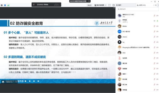 会议第二部分,罗老师向大家做了防诈骗教育。在会上,强调了预防诈骗的重要性,总结了身边主要的诈骗手段,例举了学生经常遇到的几种电信诈骗案例。并向同学们讲述了身边的真实案例,提醒了预防诈骗的注意事项。此次预防诈骗安全教育提高了同学们对于防诈骗的自我意识和自我防范能力。