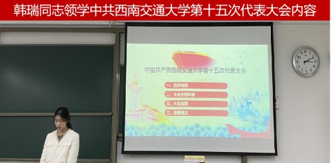 第十五次代表大会的主要内容,从召开时间、大会主要内容、大会主题以及重要意义四个部分进行了详细阐述,对学校第十五次党代会精神进行了重点传达,就我校当前和今后改革建设发展的重大问题进行了讲解。韩瑞同志强调,支部要坚持以习近平新时代中国特色社会主义思想为指引,紧紧围绕学校的发展思路,不断加强学习教育,贯彻落实本次党代会精神。全体党员认真学习会议内容,表示将不断强化责任担当,践行初心,以更加自信自觉的历史担当,投身于建设交通特色鲜明的世界一流大学的新征程!