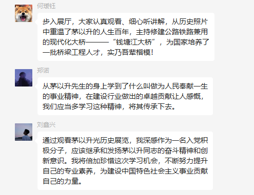 研建筑学学硕党支部和研建筑学专硕党支部的同志们饶有兴致地驻足观看了展览,并在参观结束后,积极发表自己的参观体会,学硕党支部郑诺同学说到:从茅以升先生的身上学到了什么叫做为人民奉献一生的事业精神,再建设行业做出的卓越贡献让人感慨,我们应当多学习这种精神,将其传承下去。学硕班何瑷钰和刘鑫兴同学也表示,将发扬和继承茅老精神,为建设中国特色社会主义贡献自己的力量。研建筑学专硕党支部的欧阳巧俐同志表示:“要学习茅以升先生的事迹,认识到自身的学术研究和专业发展应当与国家和社会的需求相结合,为实现中国梦、民族复兴贡献自己的力量。”
