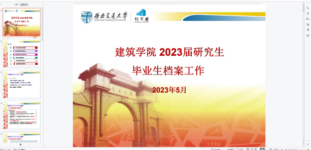 为更好地为了让2023届毕业生了解档案转递工作、及时准确完成毕业去向登记,顺利办理离校相关手续,2023年5月30日,建筑学院2023届硕士研究生档案工作宣讲会在线上进行,辅导员赵思琦老师主持会议。