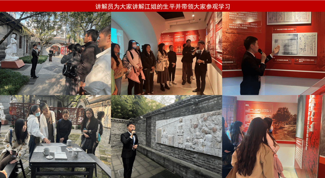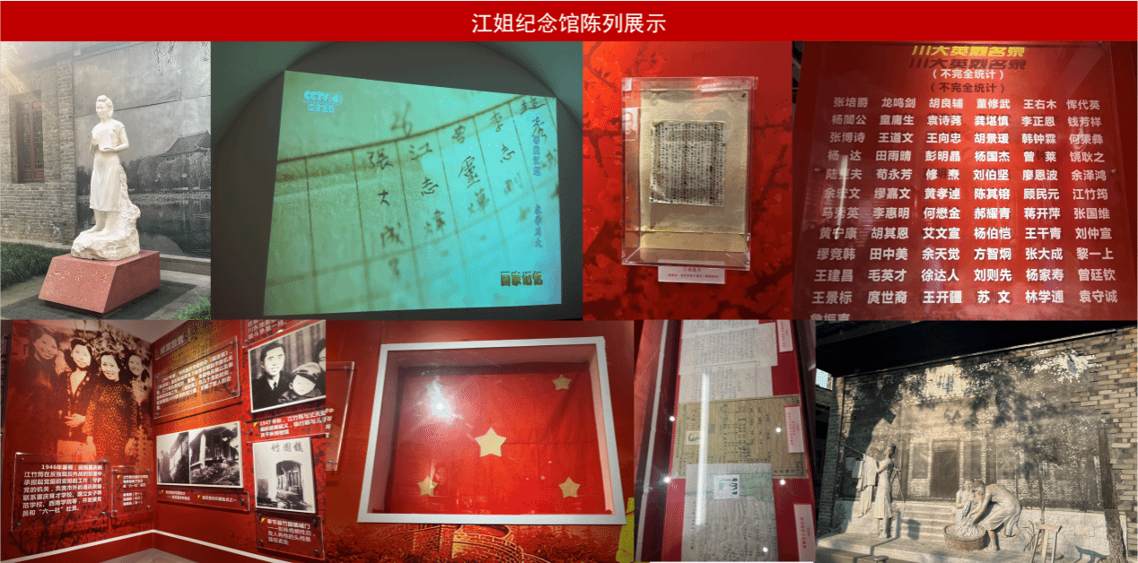 活动伊始,由讲解员带领大家依次参观江姐纪念馆。走进江姐纪念馆内,迎面而来的是怀抱着书本、洋溢着青春气息的江竹筠烈士雕像,让人肃然起敬、心怀敬意。紧接着,在讲解员的带领下,来到江姐事迹主展厅,参观“锦江红梅傲雪开”主题展览。展厅通过“少年时代”“江姐在川大”和“百炼成钢”三个部分,展现了江姐短暂而辉煌的一生。大家认真参观着展壁上的历史资料、珍贵照片和展柜中的实物档案,一张张珍藏的历史图片,一件件宝贵的陈列实物,详细了解江姐从早年求学、入党,再到在川大学习、生活及开展革命活动,从被捕入狱到最后坚贞不屈、英勇就义的可歌可泣的革命人生,生动地再现了江姐的英雄事迹,还原了一个思想进步,青春热情的江竹筠形象。
