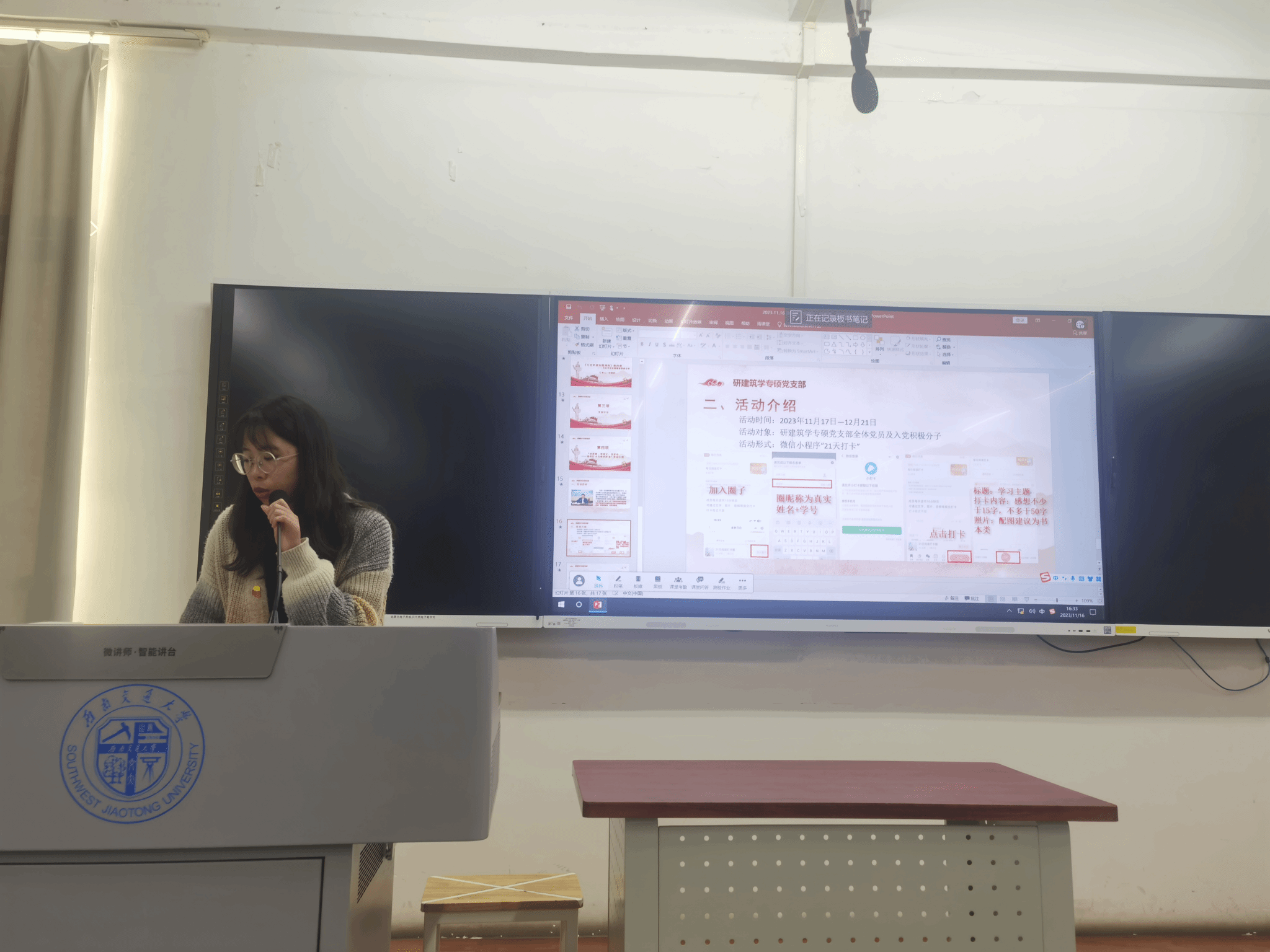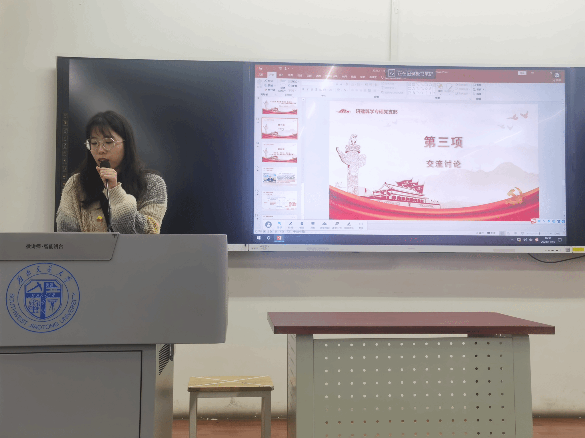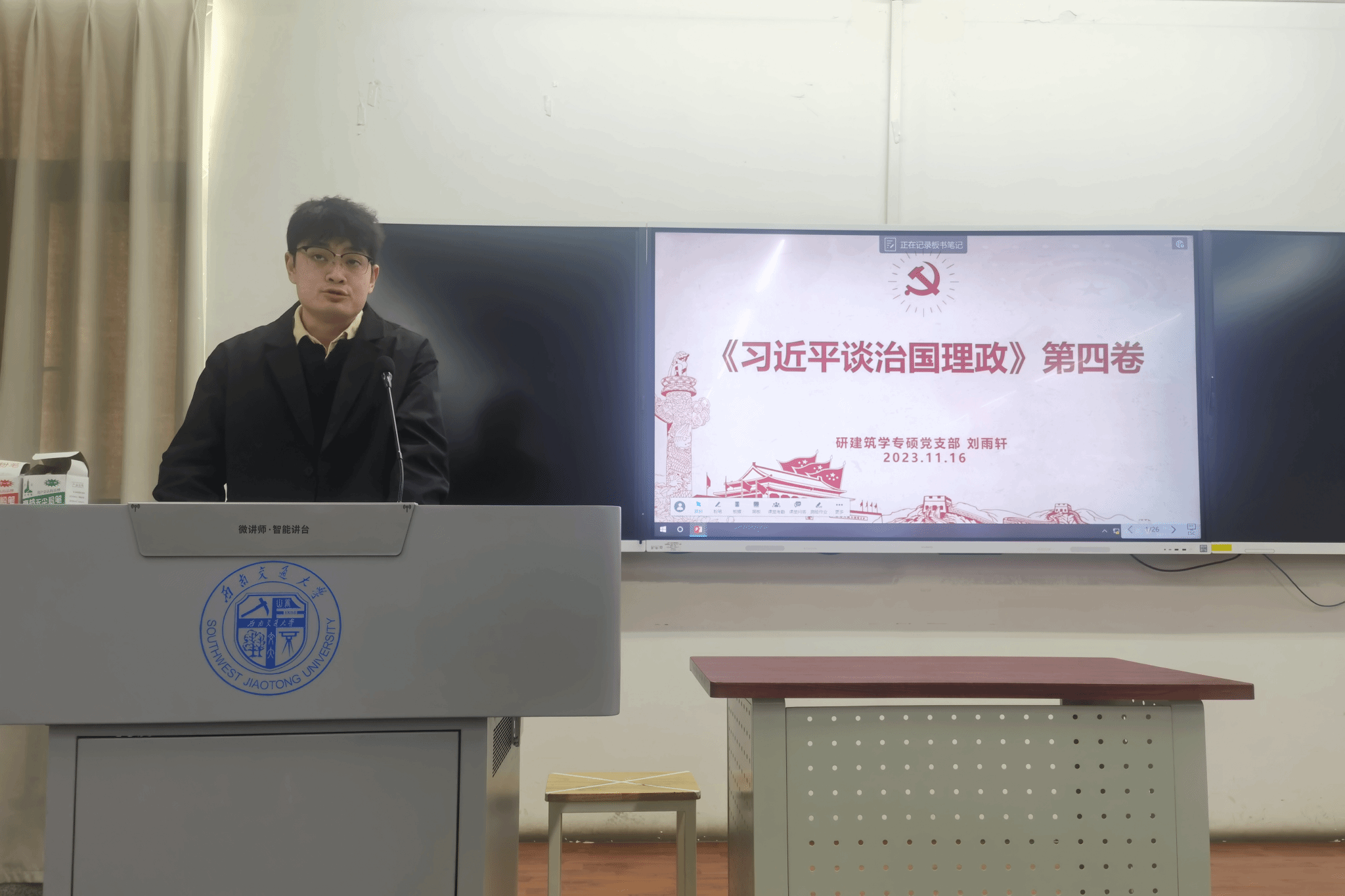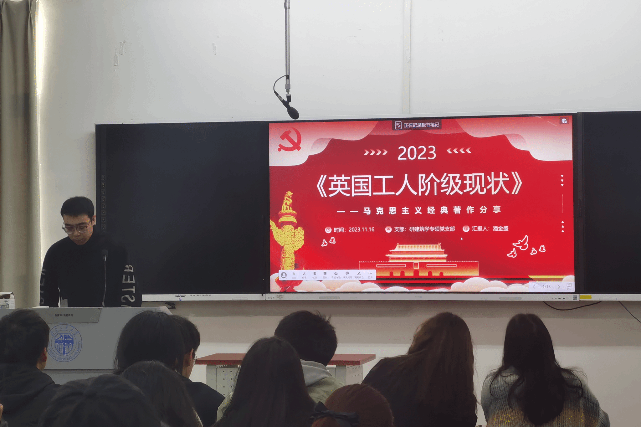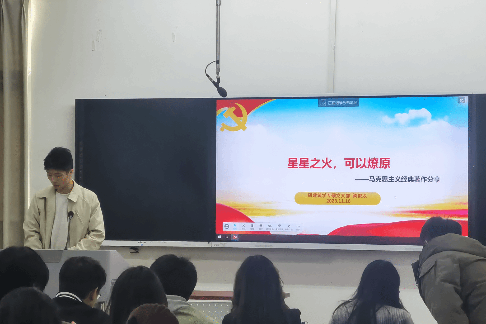 2023年11月16日16时至17时,研建筑学专硕党支部在X8323教室展开了“读原著、学原文、悟原理、凝心铸魂担使命”的组织生活会。本次组织生活会有四个环节,分别为:学习“读原著、学原文、悟原理”的重要性、“马克思主义经典原著及习近平总书记治国理政思想”相关图书知识分享、“交流与讨论”环节和“读原著、学原文、悟原理”活动介绍。本次活动由研建筑学专硕党支部委员谢仕菊同志主持,研建筑学专硕党支部全体党员和积极分子共同参加。