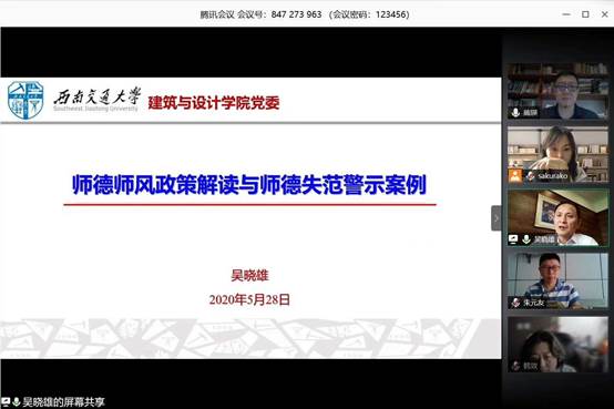 2020年5月28日星期四下午建筑系通过腾讯会议平台,认真聆听了党委书记吴晓雄为全系教师宣讲的《师德师风政策解读与师德失范警示案例》。