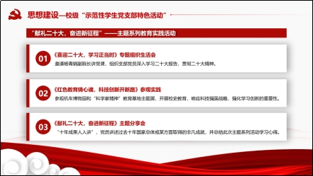 为加深党员们对我国取得的历史性成就和发生的历史性变革的了解,12月19日,支部于线上开展了《献礼二十大,奋进新征程》主题分享会。根据党员们的学科特长,以“十年成果人人讲”为分享主题,鼓励大家采用PPT图文排版的形式分享过去十年国家总体或某方面取得的非凡成就。党员们积极参与,有的从衣食住行察生活之变、有的结合专业兴趣赞美乡村振兴、还有的用生动范例展望生态文明建设……党员同志们以自己的方式抒发对党和祖国的真挚情感。