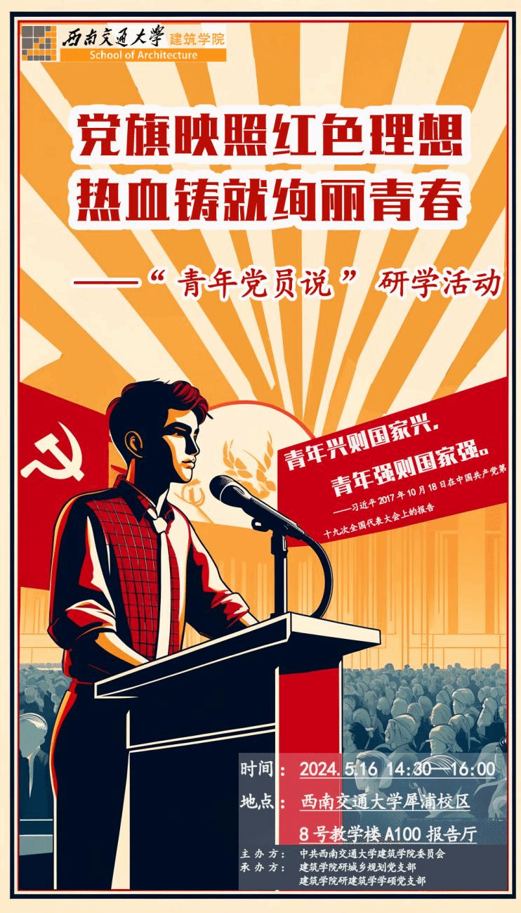 建筑学院委员会主办,建筑学院研城乡规划党支部、建筑学院研建筑学学硕党支部承办的“党旗映照红色理想、热血铸就绚丽青春——‘青年党员说’研学活动”活动来啦!