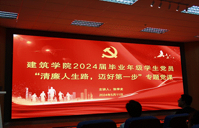 2024年5月11日下午,为深入推进党纪学习教育,筑牢党员的初心与使命,教育引导大学生打好人生底色,在成长拨穗期扣好廉洁自律的“第一扣”,在成长黄金期系好廉洁自律的“安全带”,建筑学院党委邀请学校党委副书记、纪委书记张学龙为学院2024届毕业生党员讲授“清廉人生路,迈好第一步”廉洁教育专题党课。学院党委副书记、纪委书记刘一杰,学生工作组全体辅导员及毕业生党员、研建筑学党支部全体党员和其他党员、入党积极分子代表参加了党课学习。党课由学院党委书记胡伟主持。