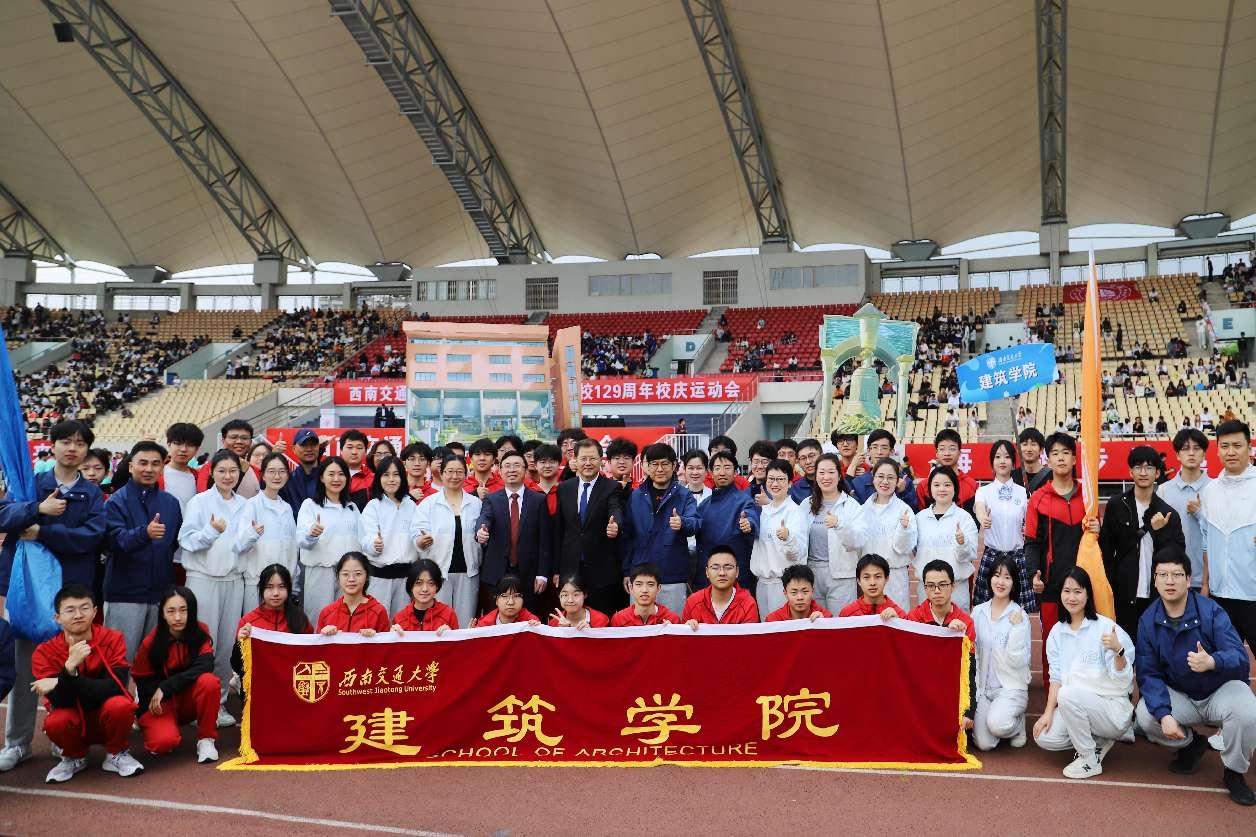 第124届运动会暨建校129周年校庆运动会在犀浦校区隆重开幕。本届运动会以"以学生为中心、以教师为主体,谱写教育强国建设西南交大新篇章"为主题,坚持五育并举理念,展现师生精神风貌。建筑学院院长沈中伟、党委书记胡伟率全体班子成员,带领由40名教师代表和60名学生代表组成的方阵,以独具学科特色的创意展示惊艳亮相。